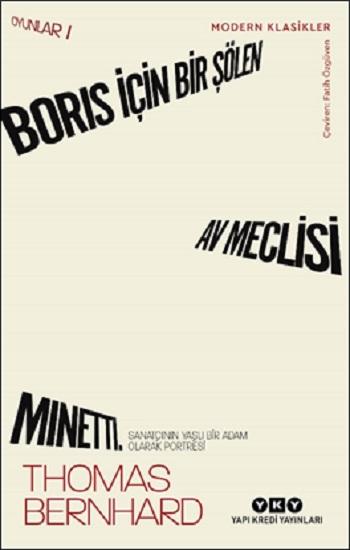 İlk kez 1970’te sahnelendiğinde, bazı eleştirmenler tarafından “absürd tiyatro” örneği olarak etiketlenip “hiciv boyutu ve burjuvazi eleştirisi” görmezden gelinmek istenen Boris İçin Bir Şölen’in ilk yazımı 1965’e kadar geri gider. Oyun aynı yılın yaz aylarında Salzburg Tiyatro Festivali için “fazla karanlık” bulunarak kabul görmemiştir. Bu oyunda, tıpkı kendisi gibi bacaklarını kaybetmiş İyi Kadın’ın yıllar önce evlenip Kötürümler Bakımevi’nden çıkardığı Boris’in doğum günü için düzenlenecek şölen konu edilir; şölene Bakımevi’nden on üç kötürüm konuk olacaktır. Bernhard’ın pek çok kez en başarılı eseri olarak adlandırdığı Av Meclisi’nde General ve eşinin av köşkünde bir oyun yazarı konuktur. –Bu Yazar karakteri Bernhard’ın yapıtında ilk kez bir tür yazınsal ayna karakter olarak belirir.– Av köşkünü çevreleyen ormanı bütünüyle kabuk böceği sarmıştır ve Stalingrad muharebesinde tek kolunu kaybetmiş General ölümcül bir hastalığın pençesindedir. Bernhard’ın ünlü Alman tiyatro oyuncusu Bernhard Minetti’ye ithafen kaleme aldığı Minetti’de, yalnız ve yaşlı bir oyuncu olan Minetti karakteri, bir yılbaşı gecesi, Flensburg Tiyatrosu’nun başyönetmeniyle buluşmak için Atlantik Okyanusu kıyısındaki karlı Oostende’de üçüncü sınıf bir otele gelir. Kendisini ilk kez üne kavuşturan Kral Lear’i otuz yıl sonra yeniden oynayıp sahnelere dönüşünü taçlandırmak niyetindedir fakat yolunu dört gözle beklediği başyönetmen bir türlü ortalıkta görünmez. Bernhard’da drama fikri, romanları, anlatıları, öyküleriyle kurduğu bütünlük bağlamında “felsefi güldürü izlencesi”nin yazınsal esaslarından biridir. Bernhard’ın tiyatro oyunları, ülkesi Avusturya’nın acı gerçeklerini seslendirirken evrensele uzanan yapıtı içerisinde dünya yaşamını aynı anda bir güldürü ve tragedya olarak betimleyen, ciddiyetle gülünçlük arasında gerçekliğin birbiriyle çelişen çift yüzünü resmeden güçlü bir repertuvar oluşturur: Sesi sönmeyen bir sözcük senfonisi, susmayan bir acı kahkaha. “İnsanlar tiyatroya gelirler / büyük bir oyuncuyu seyretmek için / ama gelir gelmez de onun tekinsizliğini itici bulurlar / Tekinsizlik sergilediğinde sanatçı / ki sergilemelidir / seyirci bunu itici bulur / Oyuncu göstermelidir onu / Tekinsizliği başka hiçbir şeyi değil” “Onda beni her zaman büyüleyen, dilinin ritim ve ton açısından taşıdığı müzikalitedir. Oyunları da adeta senfonik cümleler halinde bestelenmiştir. Beni en çok etkileyen oyunu Strindbergvari bir oda oyununun yoğunluğuna eriştiği Av Meclisi’dir.” Carl Zuckmayer