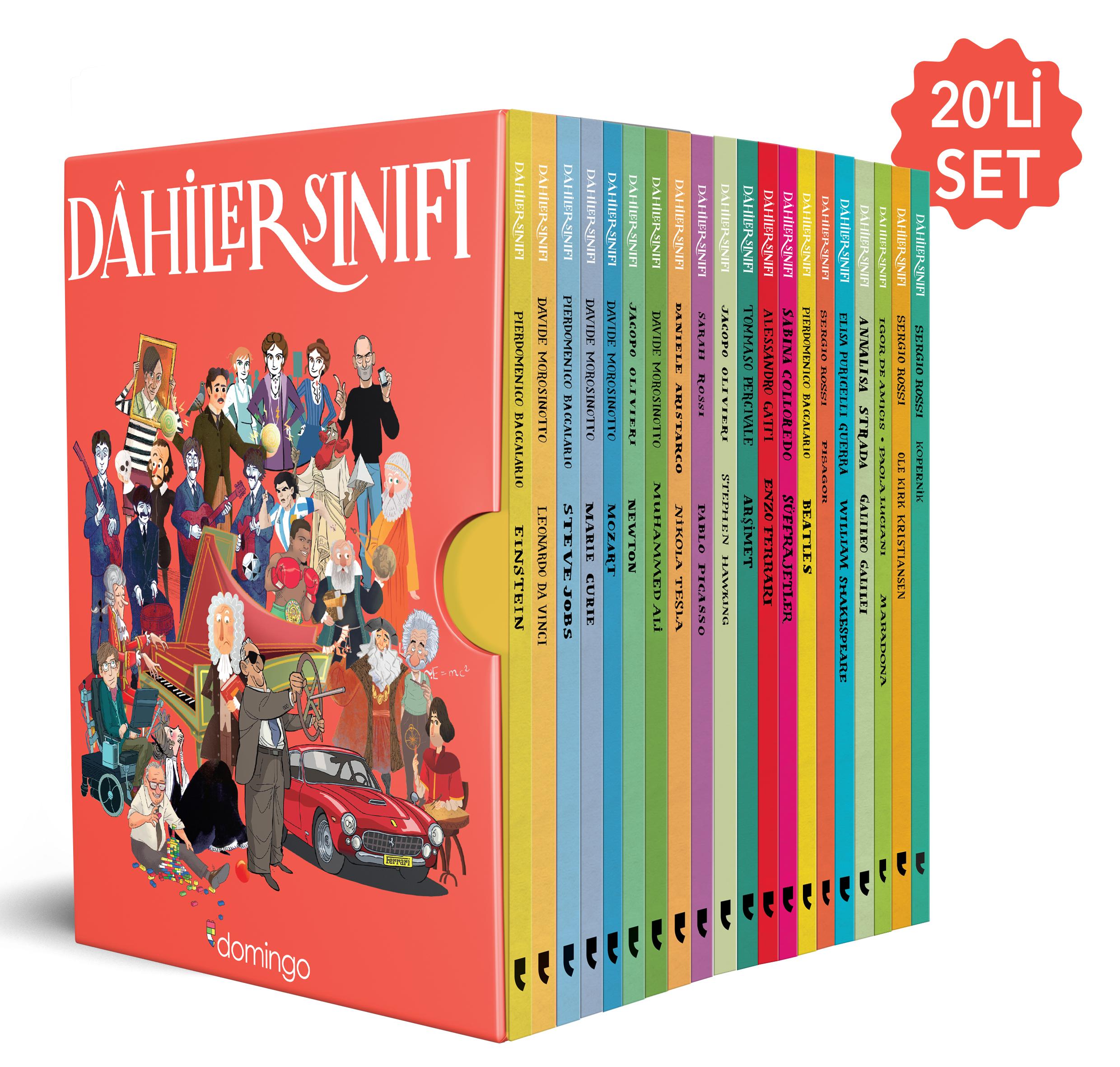 DÂHİLER SINIFI: OKUMASI KOLAY, UNUTMASI ZORDâhiler Sınıfı Serisi Hakkında:Bunlar, her biri kendi yöntemiyle; kelimeleriyle, icatlarıyla, seçimleriyle ve hatta kaderleriyle dünyayı değiştirmiş kadınların ve erkeklerin hayat hikâyeleri; şaşkınlık ve hayranlık duymanızı sağlayacak, hayal gücü ve merak duygunuzu harekete geçirecek büyüleyici hikâyeler. Dâhiler Sınıfı serisi bu özel insanları çocuklarla (9 yaş ve üstü) tanıştırmak üzere tasarlandı. İlk olarak yayımlandığı İtalya’da büyük övgü toplayan ve ardından pek çok dile çevrilen Dâhiler Sınıfı, minik ebadı, renkli illüstrasyonları, bilgiyi heyecan ve macerayla birleştiren anlatımıyla çocukların kolay okuyacağı, zor unutacağı, onlara öğrendiklerinden daha da fazlasını merak ettirecek bir seri.9 YAŞ VE ÜZERİ Serinin kitapları:Einstein – Sınırsız DehaLeonardo da Vinci – Zamanın Ötesinde Bir BeyinSteve Jobs – Bilgisayara Can Veren AdamMozart – Müziğin DâhisiNewton – Fizik SihirbazıMarie Curie – Atom KadınStephen Hawking – Sonsuzluğun İzinde Bir ZihinMuhammed Ali – Tüm Zamanların En BüyüğüNikola Tesla – Geleceği Keşfeden AdamPablo Picasso – Sınır Tanımaz Sanatçı Süfrajetler – Tüm Kadınlara Oy HakkıEnzo Ferrari – Hızın EfendisiArşimet – Sayıların BüyücüsüPisagor – Ve Dünyanın En Ünlü TeoremiBeatles – Efsane DörtlüWilliam Shakespeare – Tiyatronun EfendisiGalileo Galilei – Göklerin KâşifiMaradona – Altın ÇocukOle Kirk Kristiansen: LEGO'nun YaratıcısıKopernik – Astronomi Devrimi