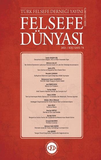 Descartes’a Göre Edilgiler, Akıl ve Ahlak Arasındaki İlişki Sebile BAŞOK DİŞ İbn Sînâ’nın Eserlerinin Latince’ye Tercüme Süreci ve Latin İbn Sînâcılığı (Avicennaism) Mehmet Ata AZ Soru Sorma ve Sorgulama Tarzı Olarak Ölüm Şahin EFİL Euthyphron İkileminin İşaret Ettiği Bazı Ahlâkî Açmazlar Mustafa ÇAKMAK Verili Bir Değer Duygusu Olarak Adalet Muhammet Caner ILGAROĞLU Bilincin Zor Problemi Aslı ÜNER KAYA Akıllı Tasarım Hareketi Yeni Bir Şey Sunuyor mu? Ferhat ONUR Tanrı’ya İnanmayan Mutlu Olamaz mı?: Aristoteles, İbn Miskeveyh, Thomas Aquinas Metin AYDIN Heidegger Düşüncesinde Bir İmkân Olarak Ölüm ve Zamanla İlişkisi Nilüfer URLU ÜNALDI Hume’un Mavisi Şule GÖLE Derrida ve Türk Harf İnkılâbı Hayriye KIRTAY Bergson’un Gülme Teorisi: Bir Cezalandırma Mekanizması Olarak Gülme Berdan KAYA Nicolaus Cusanus Armand MAURER Hikmetin İzinde Bir Fizikçi: Schrödinger ve Anlam Krizi Mehmet Zahit SEZER “Gezgin Filozof Uluğ Nutku” Üzerine Bir Değerlendirme Aziz ŞEKER