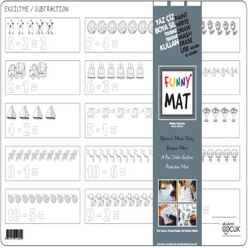 Funny Mat, her türlü aktivite için masa ve yüzey koruyucu olarak kullanılır.Üzerinde; yemek yiyebilir, boyama yapabilir, kil ve oyun hamuru şekillendirebilir, ders çalışabilirsiniz.Funny Mat’in kendisi de aynı zamanda eğlenceli bir Aktivite Materyali’dir.Su bazlı keçeli kalem ile Funny Mat üzerindeki desenleri istediğiniz gibi boyayıp renklendirebilirisiniz.Funny Mat ‘i suyun altına tuttuğunuzda boyalar hemen çıkacak ve defalarca farklı renklere boyamanız mümkün olacak.Funny Mat ile eğlence şimdi başlıyor! Kullanım Önerileri:Funny Mat kirlendiğinde yıkanabilir ya da kolayca silinebilir.Sıcak maddeler ile temas ettirilmez.Bulaşık makinesinde yıkanmaz. Funny Mat, PP den üretilmiştir ve çocuk kullanımına uygundur.Tanıtım MetniTanıtım Metni