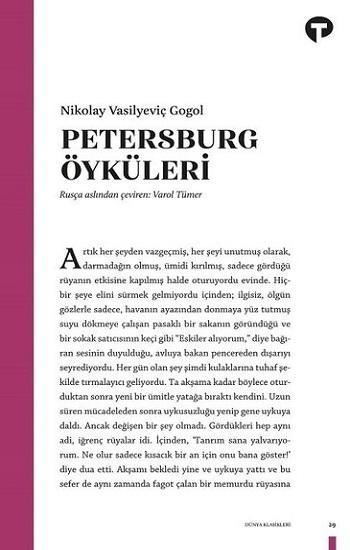 Tolstoy, “Temiz bir kalp, büyüklüğe özenmeyen hassas, ürkek bir zekâ ve olağanüstü büyük bir yetenek,” olarak tanımlamıştı Gogol’u. Petersburg Öyküleri adlı bu kitapta büyük Rus edebiyatçının “Neva Bulvarı”, “Burun”, “Palto”, “Portre”, “Araba” ve “Bir Delinin Notları” adlı altı önemli öyküsü yer alıyor.