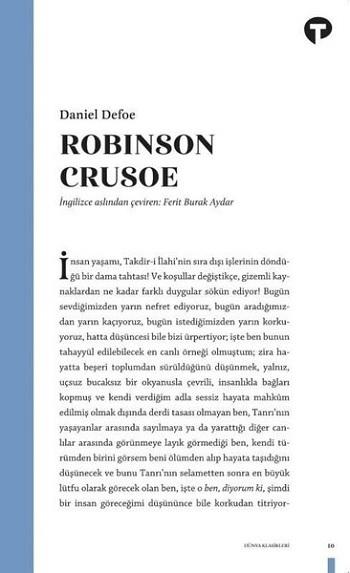 Issız bir adaya düşen genç Robinson Crusoe’nun yıllar süren hayatta kalma mücadelesi sınıf, din ve sömürge tarihinin kısa bir özeti olarak görülebilir. Gazeteci Daniel Defoe’nun kitabı 300 yıl önce yayınlandığında, edebiyatta yepyeni bir türün habercisi sayılmıştı. Dünya romanının ilk örneklerinden kabul edilen Robinson Crusoe, bugün hâlâ en çok okunan klasikler arasında.Tanıtım MetniTanıtım Metni